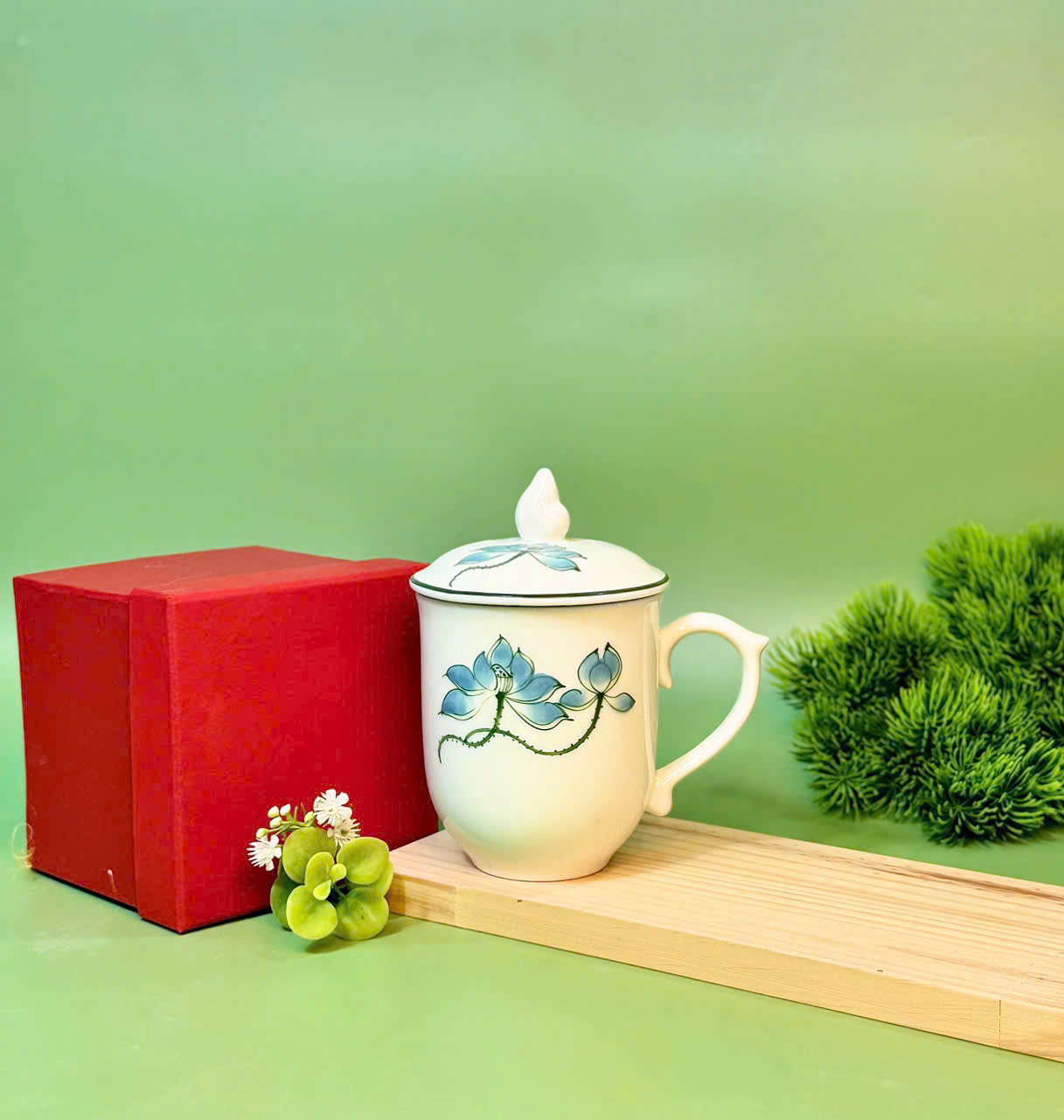 Ly sứ quà tặng chóp lửa men kem vẽ hoa sen màu xanh